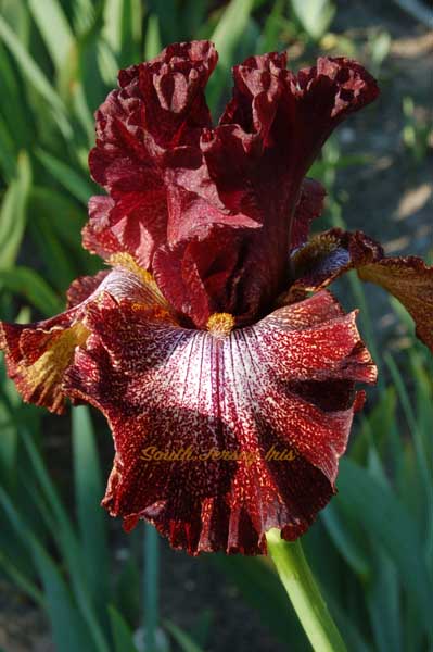 Richard Tasco, 2014. TB; ht approx 41"; blooms early to midseason. Standards dark burgundy wash over yellow-white ground; Falls edged with wide band burgundy plicata wash and dots over yellow-white ground, white area showing through center; beards based white, tips golden red-brown; moderately ruffled; purple based foliage' pronounced citrus fragrance. Honorable Mention 2016.