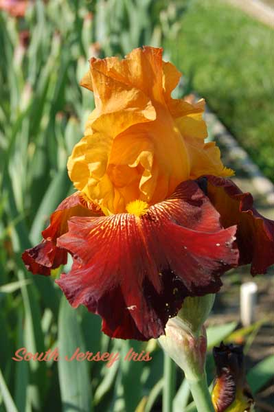 Neva Sexton, 1983. TB; ht approx 36"; blooms midseason. Standards golden brown; falls rich black, gold haft markings; beard golden brown.