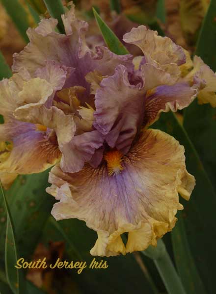 Tom Burseen, 2018. TB; ht approx 35"; blooms late midseason. Standards blend of cream, light blue and tan; falls creamy yellow, red-purple, brown and blue shaded washing; beards yellow in throat, orange in middle and end; ruffled.