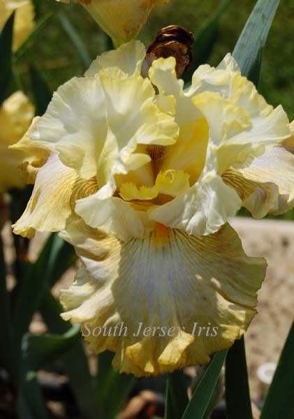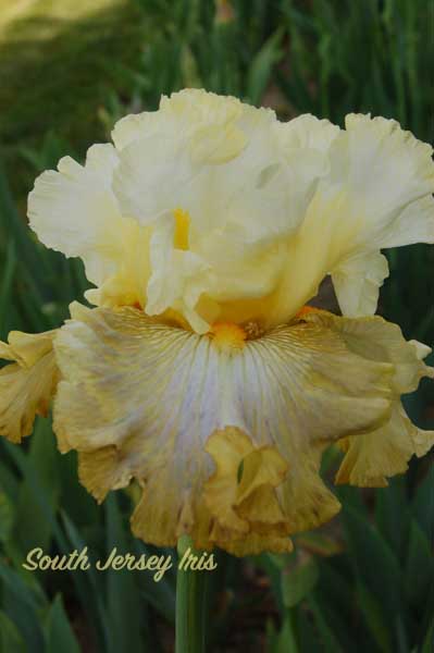 George Sutton by Michael Sutton 2016. TB; ht approx 37"; blooms early to late. Standards butter yellow; falls white around beard blending to pale lavender to a soft butterscotch edge; beards orange; ruffled and serrated; pronounced spicy fragrance. Honorable Mention 2018.