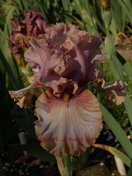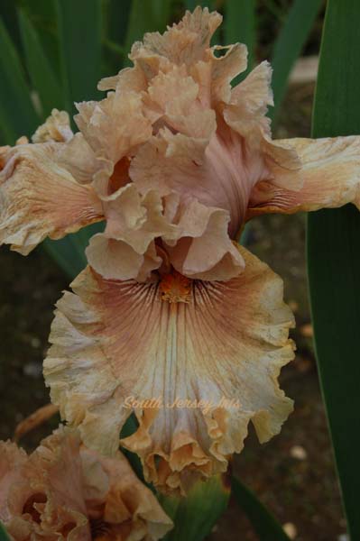 Thomas Johnson, 2021. TB; Ht approx 35"; blooms early. Standards deep toasted watermelon with lighter edge; falls creamy pink, deeper toasted watermelon around beard, light buff pink band; beard hairs based white, tangerine tips; sweet fragrance. Honorable Mention 2024.