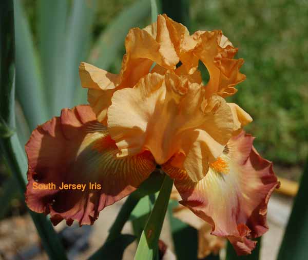 Tom Burseen, 2016. TB; ht approx 37"; blooms late. Standards tangerine orange-apricot blend, style arms dark tangerine-orange; falls brown, creamy-orange washed center, white burst around flame beards. Ruffled.