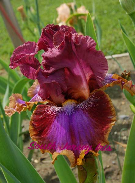 Tom Burseen, 2023. TB; ht approx 35"; blooms late to very late. Standards indian lake over pale blue; falls brick red, washed violet blue center, currant red washed hafts peppered white, marigold orange edges; beards marigold orange in throat, tan in middle, ends blue; ruffled.
