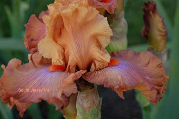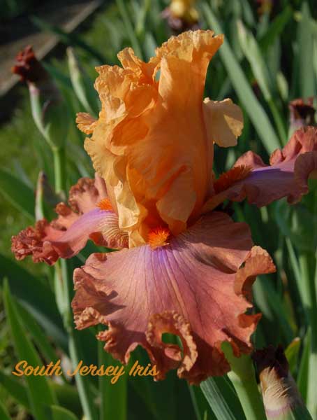 Barry Blyth, 2009. TB; ht approx 34"; blooms midseason. Standards coral orange; falls orange- sienna overlaid creamy apricot around beard, large violet flash beside and below beard; beards vibrant tango-orange. Ruffled and flared. Sweet fragrance.