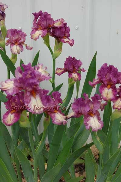 Paul Black, 2009, IB, 27", ML-VL. Standards medium raspberry, overall network of darker veins; style arms medium pinkish-raspberry; falls cream, very wide medium raspberry plicata band covering 2/3 of petal, medium raspberry plicata lines and dots over center 1/3 and wide stripe from end of beard to 2/3 of way down center, variable amount of markings on center; beards orange, white at end; ruffled; slight musky fragrance. Honorable Mention 2011, Award of Merit 2014, Sass Medal 2018.