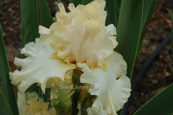 George Sutton, 2011. TB; ht approx 37"; blooms early, midseason or late. Standards light peach-cream flushed pink; falls light devonshire cream; beards apricot orange. Ruffled with sweet fragrance. Honorable Mention 2015.