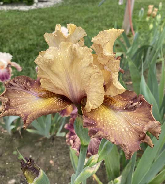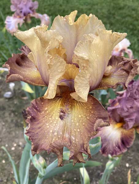 Tom Burseen, 2023. TB; Ht approx 35"; blooms early. Standards chinese yellow, nasturtium orange base; falls light cadmium orange, washed magenta rose, pale blue wash at center, yellow washed edges; beard hairs based yellow, tips orange, tattered and hairy magenta rose horns; ruffled and flared; pronounced musky fragrance.