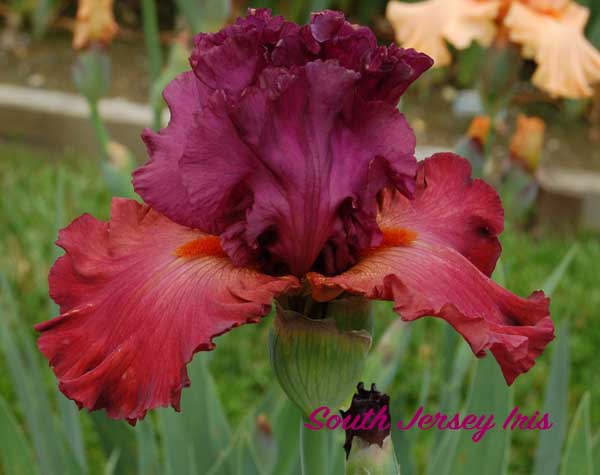 J. Terry Aitken, 2010. TB; ht approx 38"; blooms midseason. Standards red purple; falls orange red, darker rim; beards red. Honorable Mention 2013, Award of Merit 2016.