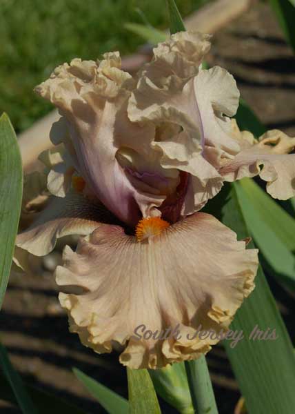 Tom Burseen, 2020. TB; Ht approx 35"; blooms midseason. Standards champagne, pale purple base; falls champagne washed cinnamon, champagne washed edges; beards orange in throat and middle, champagne ends; ruffled; sweet fragrance.