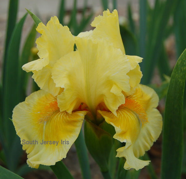 Barry Blyth, 2014/15. IB; Ht approx 22"; blooms early, midseason and late. Standards lemon yellow; falls lemon yellow with huge golden yellow blaze down petal; beards golden orange, tip lavender; sweet fragrance.