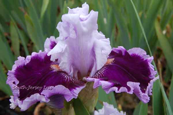Thomas Johnson, 2012. TB. Blooms midseason. Ruffled. Standards white with light violet wash. Falls violet with white band. Beards tangerine. Ht approx. 35". Award of Merit 2016, Wister Medal 2019, American Dykes Medal 2021.