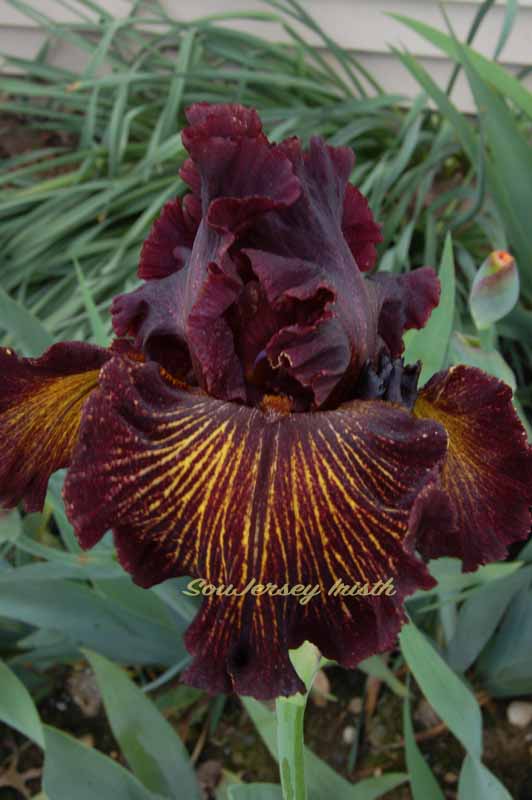 Keith Keppel, 2016. TB; Ht approx 35"; blooms midseason. Standards black-mulberry, slightly lighter center speckling; falls black-mulberry edge, lighter and redder rays into intense golden-yellow ground; beard hairs based lavender-white, brown in middle, light mustard tips. Honorable Mention 2018, Award of Merit 2021.