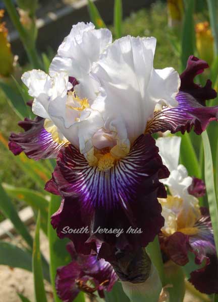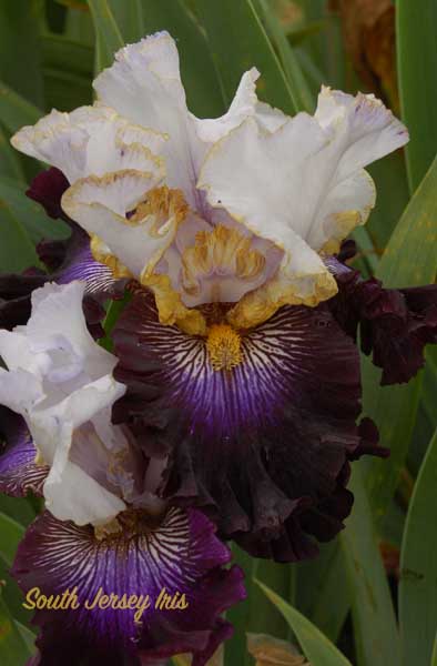 Kent Pfeiffer, 2021. TB; ht approx 36"; blooms early to midseason.  Standards light steel blue, gilded edge; falls black, electric purple central area striated black; beards old gold; ruffled.
