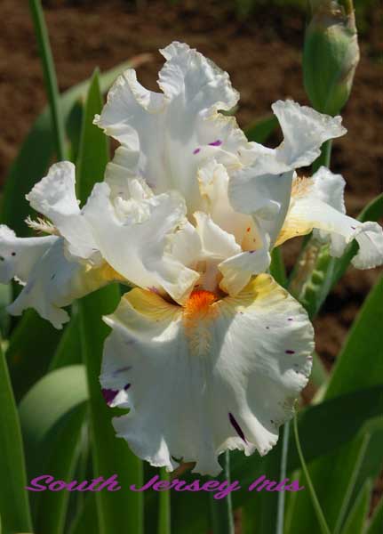 Tom Burseen, 2015. TB; ht approx 35"; blooms early to late. Standards pure white, random splattering of red-purple; falls white, yellow-gold washed hafts, random dark purple splatters; beards poppy orange, feathered horns; flared and ruffled' slight sweet fragrance. Honorable Mention 2017; Award of Merit 2019; John C. Wister Medal 2021; Dykes Medal 2023.