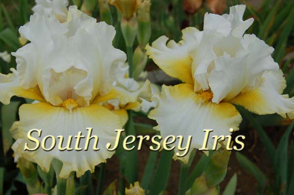 Tom Burseen, 2004. TB, blooms early to midseason. Standards white with yellow gold midribs; falls white with yellow gold shoulders. Beards dark gold. Ht approx 36".