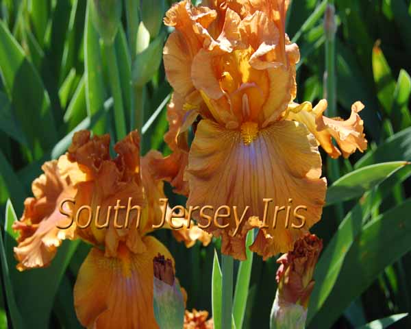 Sterling Innerst, 1998. TB. Blooms midseason. Standards and falls bittersweet brown with blue purple blaze on fall. Beards golden orange. Ht approx. 37".