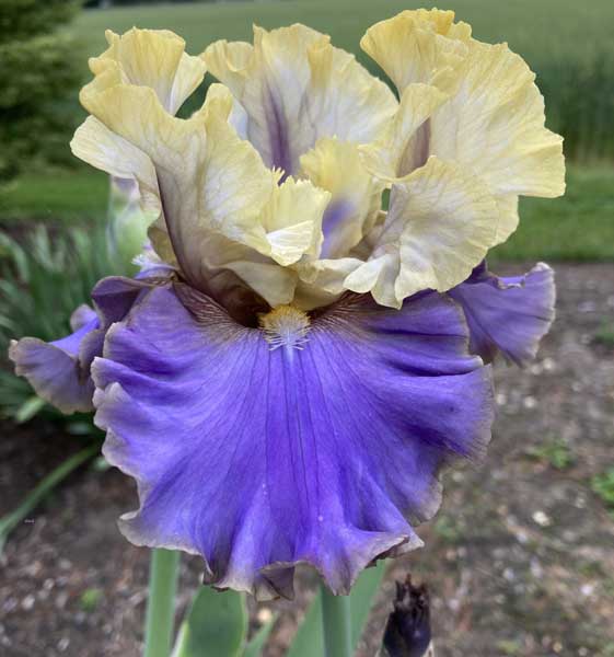 Lionell Austell, 2019. TB; ht approx 40"; blooms midseason. Standards light yellow, medium slate along center rib; falls blue, tan hafts and edges, hafts have short white lines radiating out from beards; beards yellow-tangerine in throat, yellow in middle, white at ends; ruffled; slight fragrance.