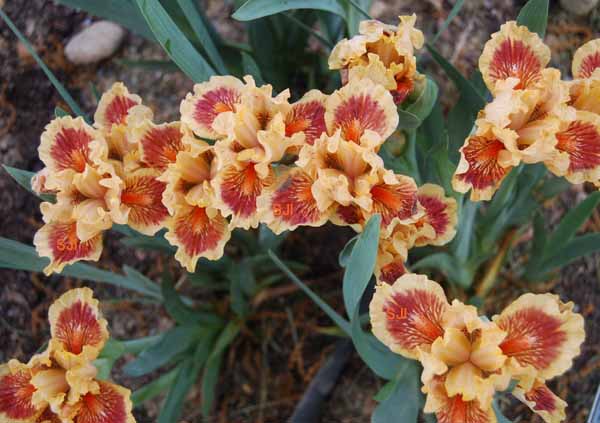 Paul Black, 2008. SDB; ht approx 15.5"; blooms midseason to late. Standards medium buff gold; falls medium buff gold with large garnet spot, medium buff gold veins beside beard; beards white, tipped dark orange; ruffled; pronounced fragrance. Honorable Mention 2010, Award of Merit 2012, Cook Douglas Medal 2014.