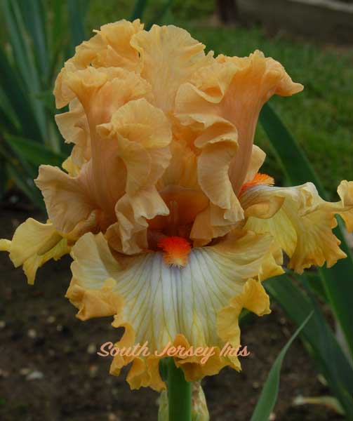 Tom Burseen, 2020. TB; ht approx 34"; blooms early to midseason. Standards carrot red blended orange, yellow washed edges; falls white, light red washed edges; beard hairs vermillion, tips pale blue; looping ruffles.