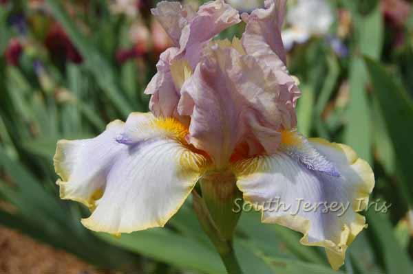 Tom Burseen, 2011. TB. Blooms early midseason. Ruffled. Standards mauve to violet; falls pale blue washed maize edges and amber gold shoulders. Beards orange to blue ending with violet blue. Ht approx. 36".