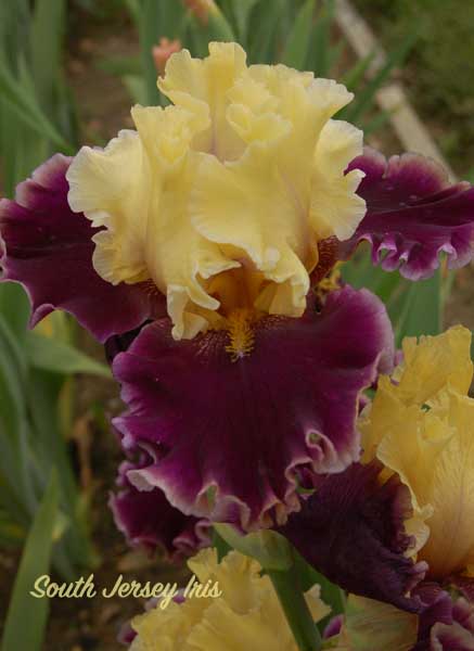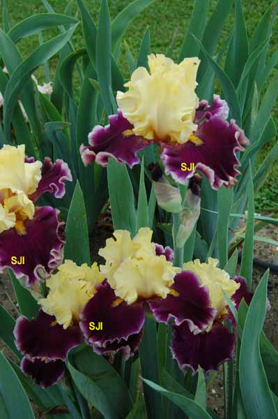 Lynda Miller, 2015. TB; ht approx 36"; blooms midseason. Standards butter yellow, light violet on style arms; falls plum-purple, pale orchid edge; beards gold. Slight musky fragrance. Honorable Mention 2017, Award of Merit 2019, Wister Medal 2021; American Dykes Medal 2022.