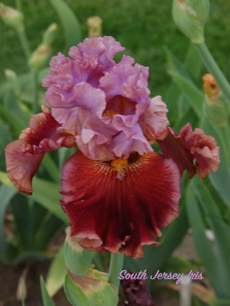 Barry Blyth, 2019. TB; ht approx 35"; early to midseason bloom. Standards soft lilac, edged buff pink; falls light burgundy lightening towards beard, muted gold edge; beards soft old gold; slight fragrance. Honorable Mention 2022.