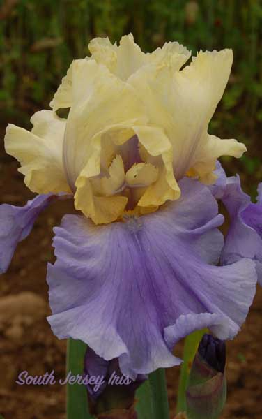 Richard Cayeux, 2000. TB; ht approx 33"; blooms late midseason. Standards light butter yellow; falls light blue lavender; beards yellow, blue lavender at end.