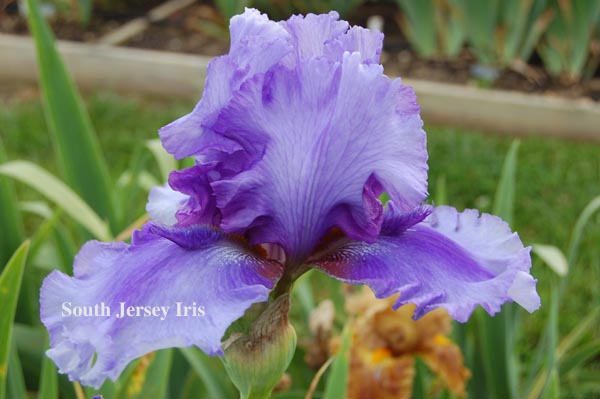 Paul Black, 2001. TB, spaceage. Blooms late in season. Standards silvery medium violet blue, darker at base; falls violet blue shaded silvery white. Beards gold, violet blue at end with fuzzy dark blue horn. Ht approx. 45". Honorable Mention 2003, Award of Merit 2005.