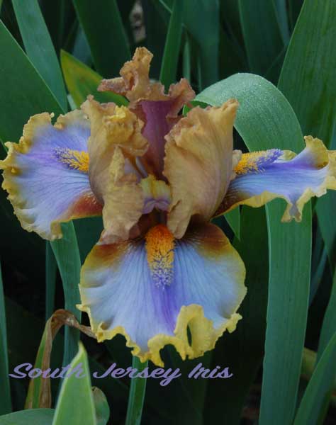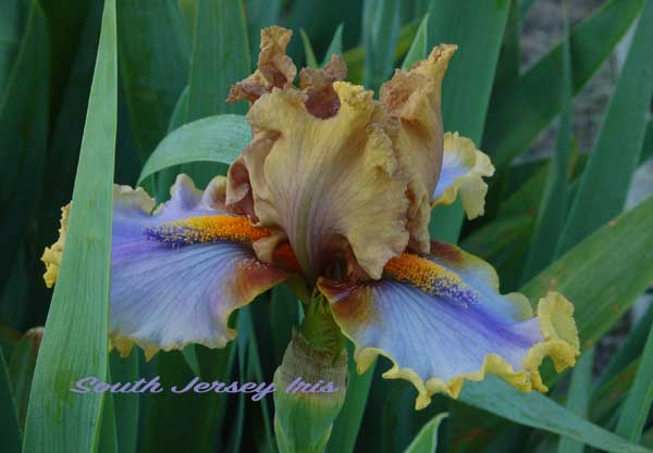 Tom Burseen, 2013. TB; ht approx 35"; blooms very early to early. Standards brown, crinkled gold edges; falls light violet-blue, maize-gold washed edges; beards huge, fuzzy glowing tangerine orange, feathered violet-blue horns. Flared with crinkled ruffled. Honorable Mention 2017.
