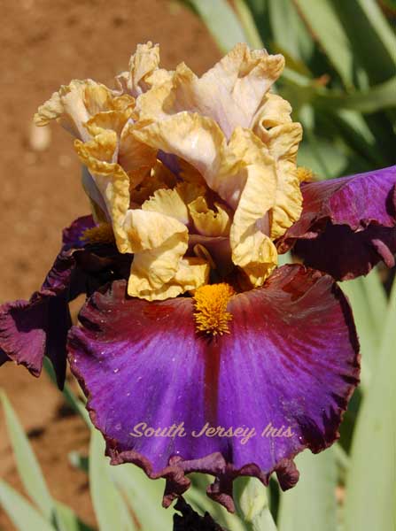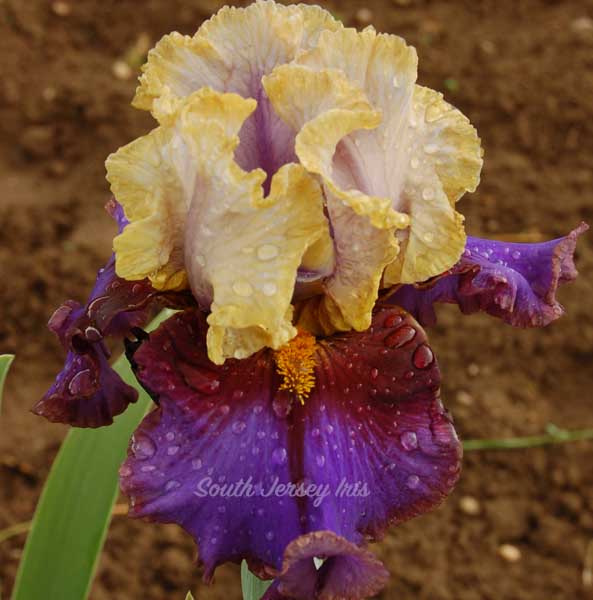 Tom Burseen, 2022. TB; ht approx 33"; blooms very late. Standards pale wisteria blue, honeysuckle washed edges, sea blue washed base; falls glowing french blue, dark violet-blue washed hafts and edges; big beards are marigold orange; wide and ruffled; slight spicy fragrance.