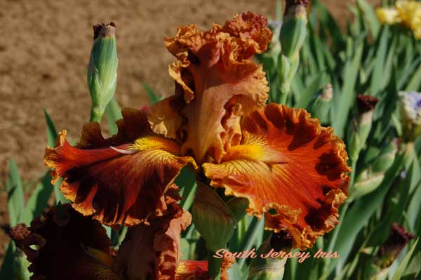 Tom Burseen, 2022. TB; ht approx 36"; blooms early to midseason. Standards gold, overlaid red-brown; falls union jack red, gold, overlaid red-brown edges; beards gold in throat, yellow in middle, ends white, some red horns along with flounces color of falls; ruffled and laced.