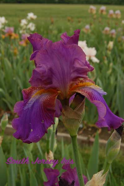 Jim Hedgecock, 1994. TB; ht approx 40"; blooms midseason. Standards dark purple; falls dark maroon at hafts, dark electric blue ray pattern extending to dark maroon edge; beards burnt gold, blue horn; ruffled; slight sweet fragrance.