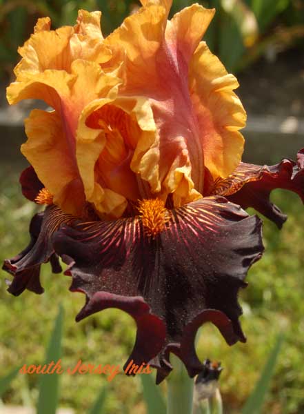 Richard Tasco, 2016. TB; ht approx 37"; blooms midseason. Standards light bronzed yellow, light rosy plum wash over midrib spreading towards edge; falls plush burgundy-black, bright yellow-orange veins next to beards; beard hairs based bronze, tips rusty brown; moderately ruffled; medium purple based foliage; pronounced baby powder fragrance. Honorable Mention 2019.