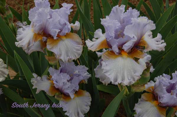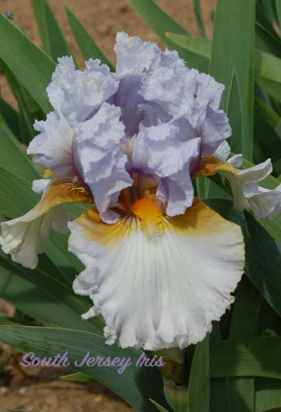 Tom Burseen, 2022. TB; ht approx 35"; blooms early. Standards wisteria blue, beech brown washed base; falls white, veined and washed lobelia blue, washed light henna hafts; beards persimmon orange in throat, cadmium orange in middle, ends pale blue, fat and fuzzy; ruffled and laced; slight spicy fragrance.