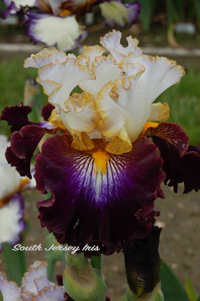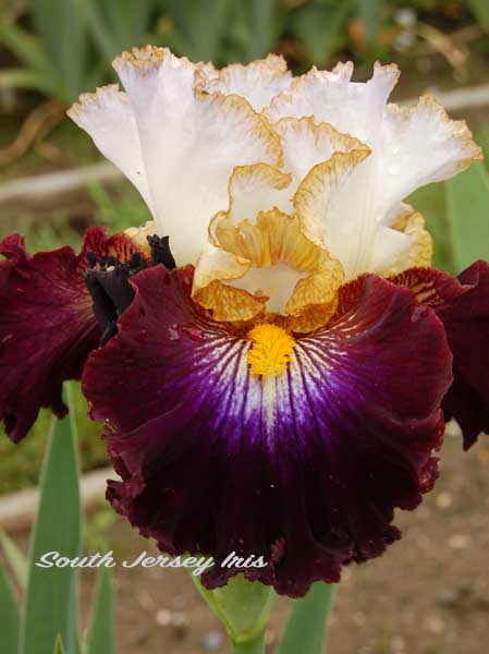 Keith Keppel, 2019. TB; ht approx 34"; blooms midseason. Standards blue-white, tan gilt rim; falls black-purple, upper central area white heavily striated purple; beards deep chrome yellow. Honorable Mention 2021, Award of Merit 2023.