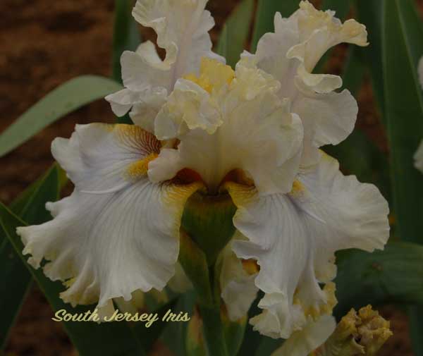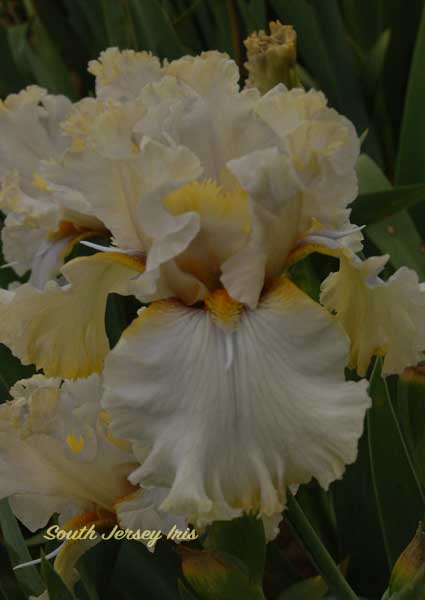 Tom Burseen, 2019. TB; ht approx 37"; blooms midseason to late. Standards cream, pale yellow washed edge, tattered edges; falls white, light yellow washed edges; beard hairs based yellow, tips orange, cream spoons; ruffled.