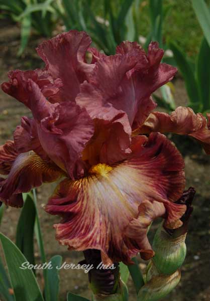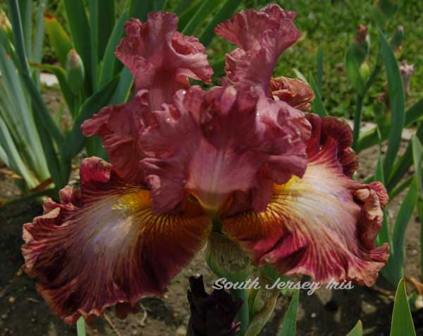Tom Burseen, 2023. TB; Ht approx 36"; blooms early to midseason. Standards rose purple, washed violet purple; falls purple, washed and streaked with heavy ruby red, edges are rose purple; beards orange in throat, yellow in middle, ends white; ruffled.