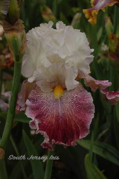 Paul Black, 2007. TB, blooms early to midseason. Standards warm white with pale gold rim; falls white and medium gold lined and sanded burgundy and amber rust., white edge.; beards medium yellow. Ruffled and laced. Ht approx. 40". Honorable Mention 2010.
