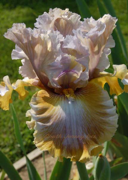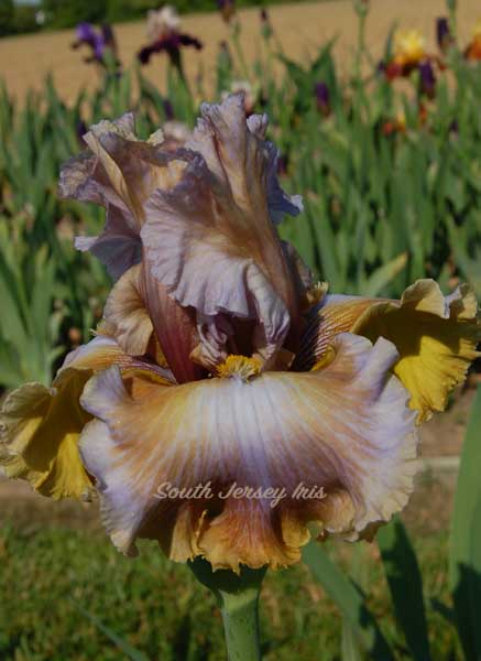 Tom Burseen, 2022. TB; ht approx 35"; blooms midseason to late bloom. Standards wistaria blue, brown washed center and base, style arms wistaria blue; falls blend of light blue, washed chrome yellow edges; beards orange in throat, chrome yellow in middle, ends light blue; ruffled; pronounced musky fragrance.
