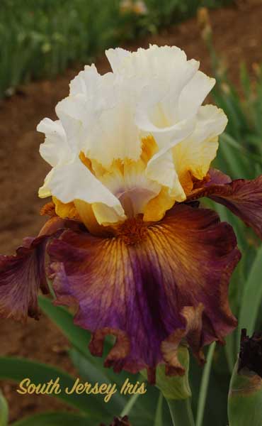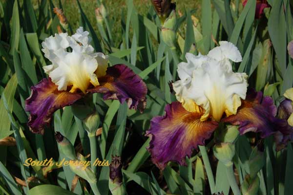 Tom Burseen, 2008. TB, blooms mid to late season. Standards white with yellow base and light blue-white style arms; falls plum purple, lighter washed edges, cream washed center, bronze hafts, black center line; beards bronze and fat. Ht approx. 35". Honorable Mention 2012, Award of Merit 2014.